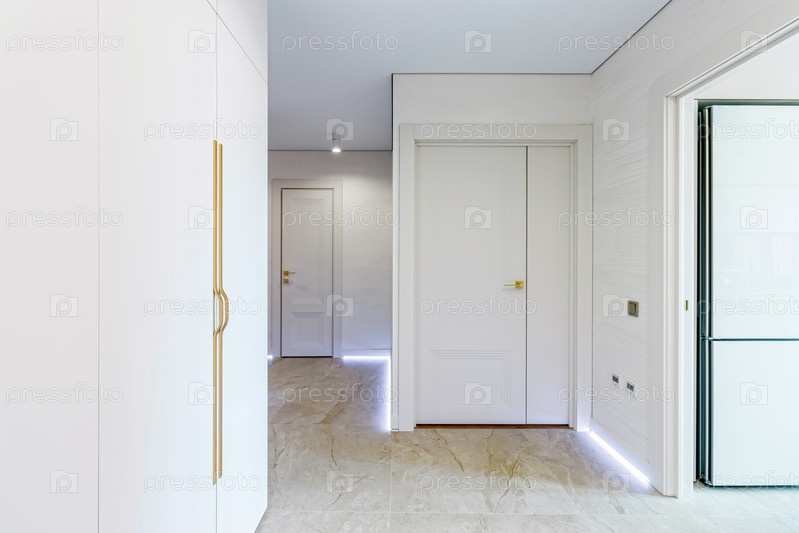Современная прихожая в светлых тонах с межкомнатными дверями белого и золотого цвета