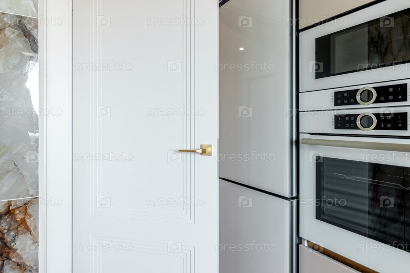 Современная белая дверь с открытой золотой ручкой, холодильником и духовкой
