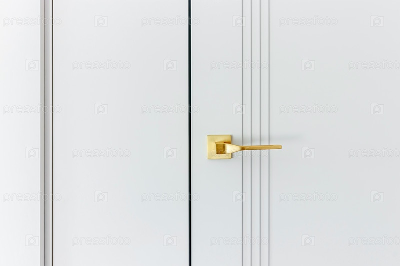 Белая дверь в классическом стиле. Открытая белая дверь в ванную. Классическая белая дверь с золотой ручкой. Крупный план
