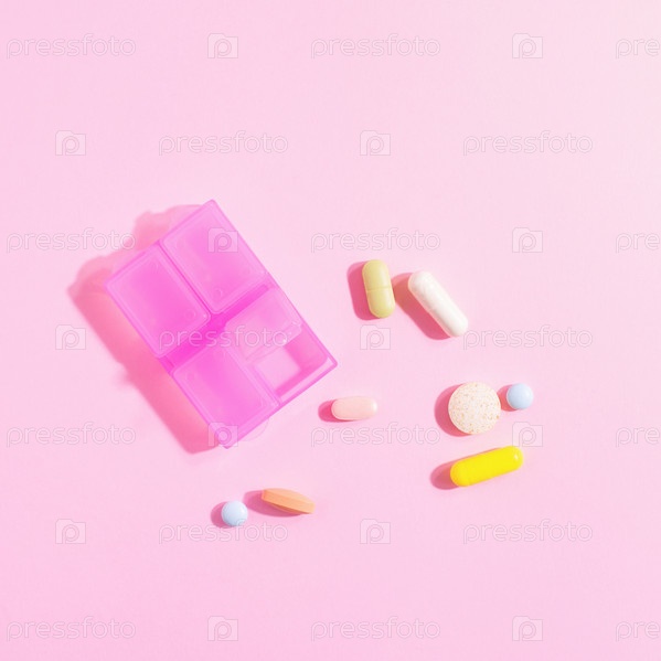 Органайзер для таблеток с разнообразными медицинскими таблетками и пищевыми добавками на розовом столе