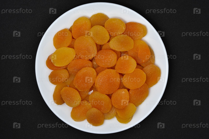 Сухофрукты на белой тарелке. Половинки сушеных абрикосов без косточек крупным планом