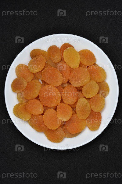 Сухофрукты на белой тарелке. Половинки сушеных абрикосов без косточек крупным планом