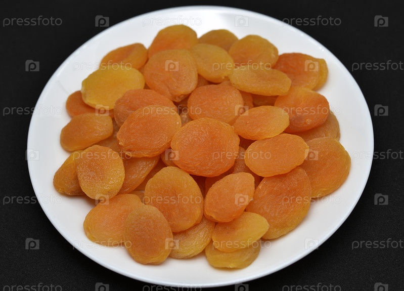 Сухофрукты на белой тарелке. Половинки сушеных абрикосов без косточек крупным планом