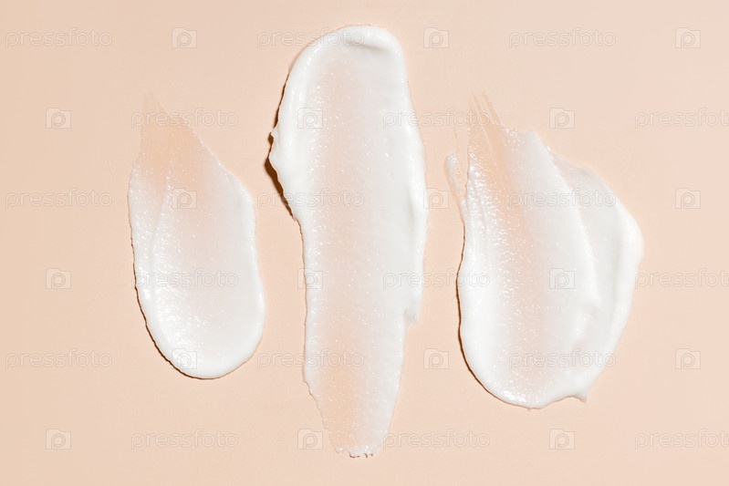 Текстура белого крема на бежевом фоне. Образец увлажняющего крема в крупном плане. Образец лосьона. Косметический продукт по уходу за кожей смазывает пятна. Образец солнцезащитного крем SPF на пастельном фоне