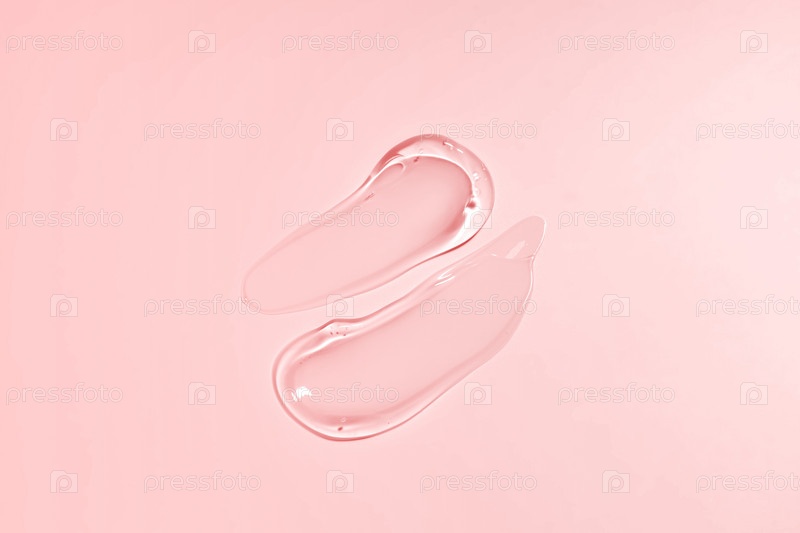Мазок жидкого геля выделен на бежевом фоне. Косметические пятна, такие как чистый прозрачный лосьон с алоэ, желеобразная сыворотка для лица, очищающее средство, гель для душа или шампунь, вид сверху