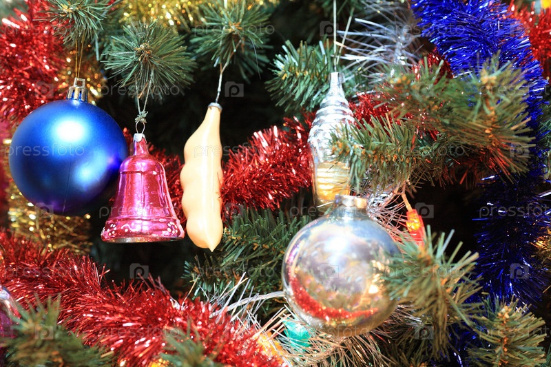 Игрушки на зеленой рождественской ели