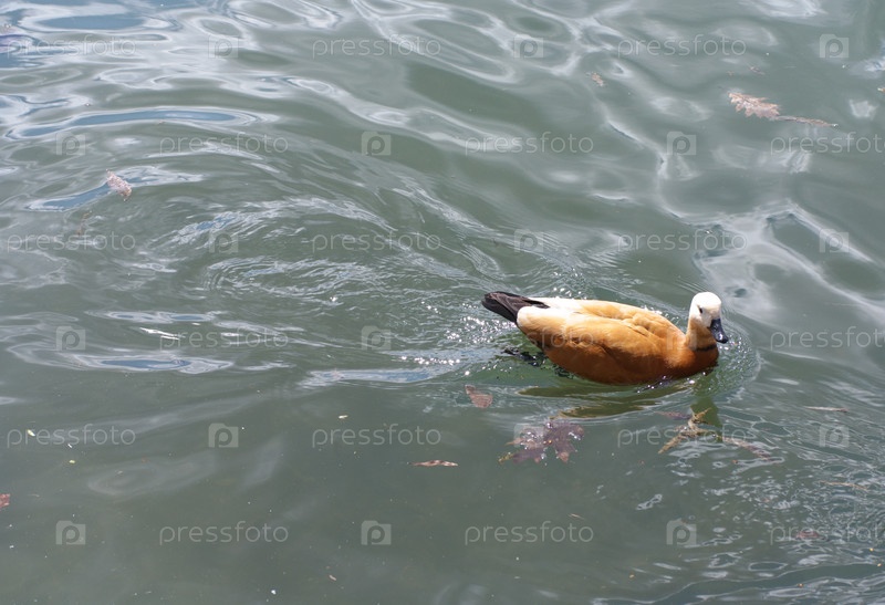Утка на воде в пруду городского парка в сухой солнечный летний день