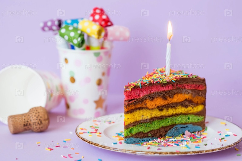 Радужный праздничный торт, украшенный праздничной свечой и конфетти. Кондитерские изделия. Разноцветный десерт цвета радуги на фиолетовом фоне