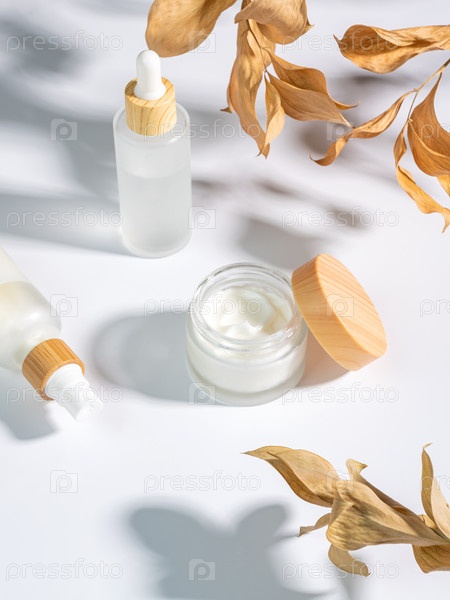 Крупный план коллагенового крема в стеклянной банке, сыворотки в бутылке из белого матового стекла и сухих листьев рускуса на белом фоне. Набор косметических средств по уходу за кожей и телом