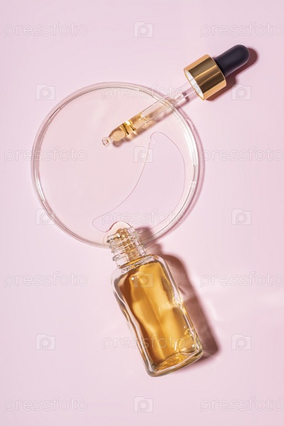 Бутылка-капельница и чашка Петри с каплями масла. Косметические лабораторные исследования. Концепция красоты волос, уход за собой и хорошее самочувствие