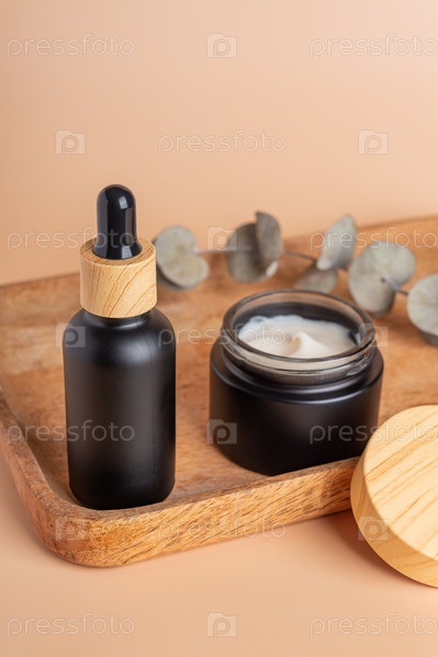 Естественная косметика в бамбуковой и стеклянной упаковках на коричневом фоне с высушенными цветами эвкалипта. Набор органических косметических средств SPA. Концепция ухода за кожей