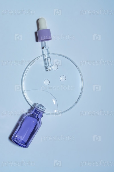 Косметическая сыворотка пипетки на чашке Петри на белом фоне. Концепция косметологии и фармацевтики. Кислотный пилинг, масло для лица, коллаген