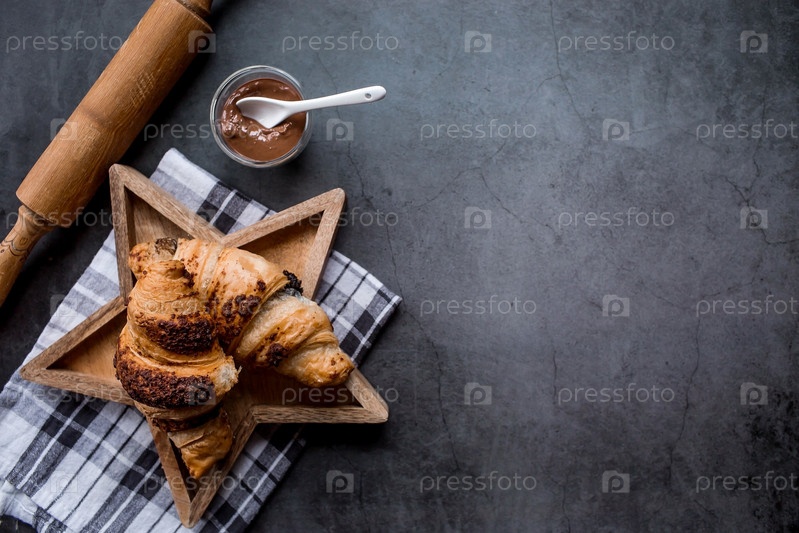 Вкусные свежеиспеченные круассаны с шоколадом на темном фоне. Французский завтрак. Вкусная выпечка крупным планом. Контекст пекарни с вкусным хлебом. Кондитерские изделия