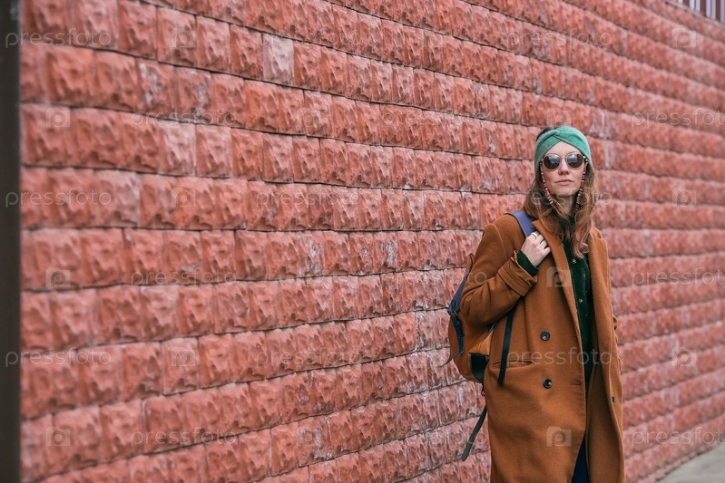 Портрет молодой 30-летней хипстерши в солнцезащитных очках и стильной одежде в городе на фоне кирпичной стены. Современный образ жизни