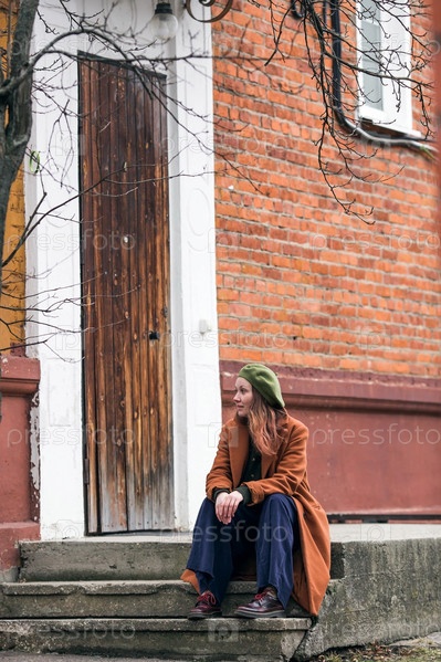 Портрет молодой женщины старше 30 лет в берете и стильном пальто, девушка гуляет по городу ранней весной. Современный образ жизни