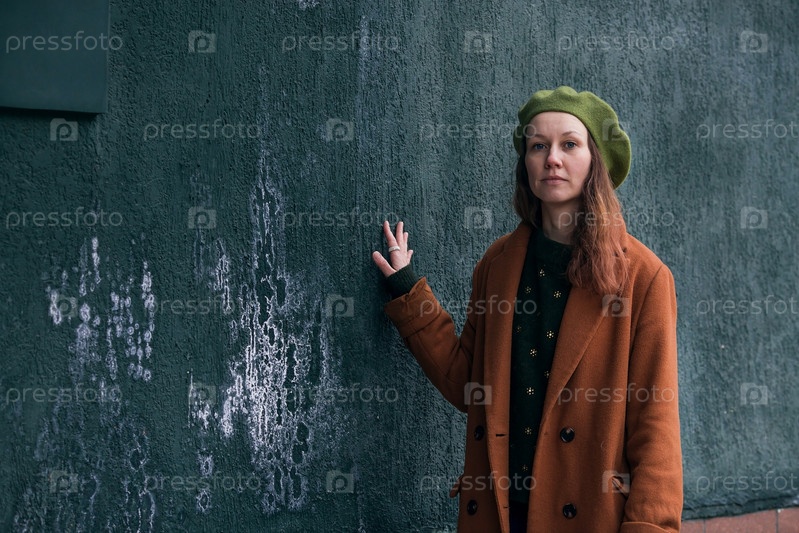 Портрет молодой женщины старше 30 лет в берете и стильном пальто, девушка гуляет по городу ранней весной. Современный образ жизни