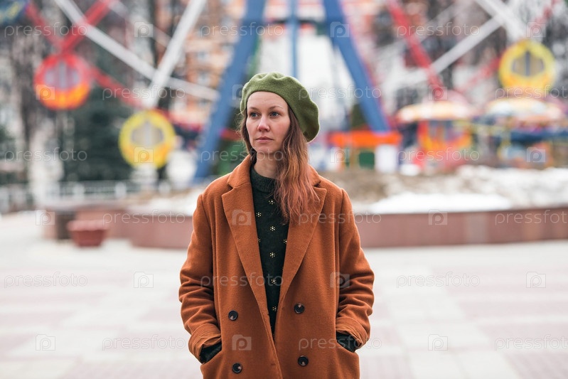 Портрет молодой женщины старше 30 лет в берете и стильном пальто, девушка гуляет по городу ранней весной. Современный образ жизни