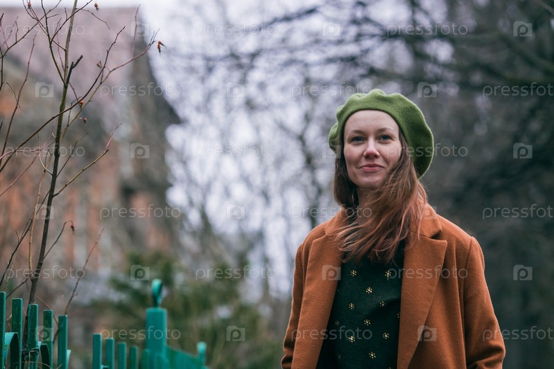 Портрет молодой женщины старше 30 лет в берете и стильном пальто, девушка гуляет по городу ранней весной. Современный образ жизни