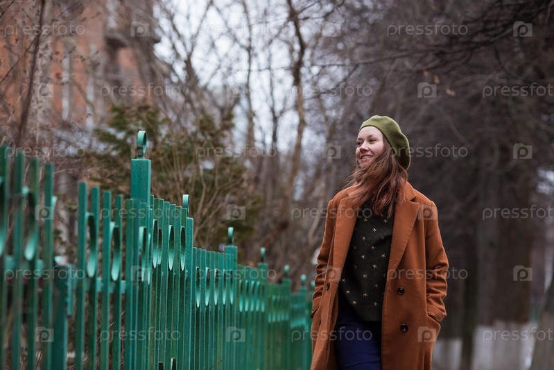 Портрет молодой женщины старше 30 лет в берете и стильном пальто, девушка гуляет по городу ранней весной. Современный образ жизни
