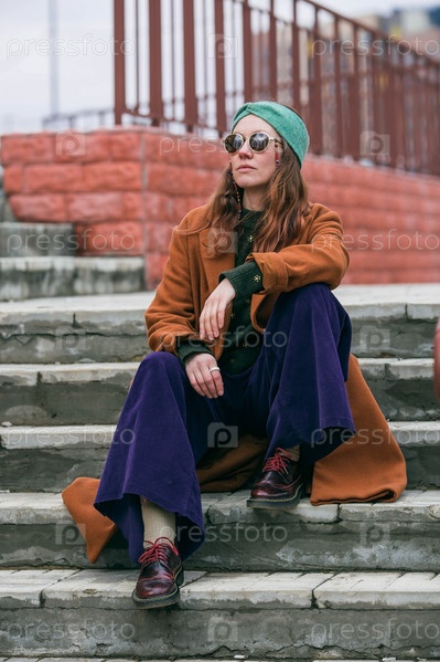 Портрет молодой 30-летней хипстерши в солнцезащитных очках и стильной одежде в городе на фоне кирпичной стены. Современный образ жизни