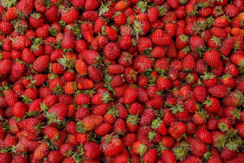 Свежая красная спелая органическая клубника на фермерском рынке. Ягодный фон крупным планом. Здоровая веганская еда