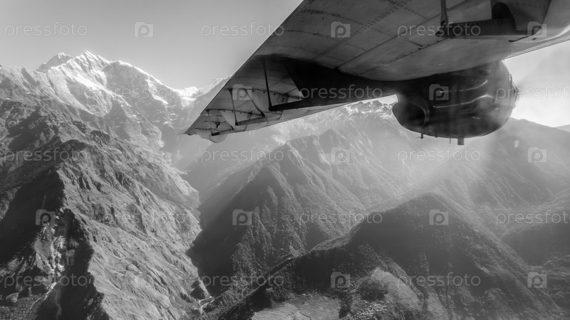 Черно-белый вид на Гималаи из иллюминатора легкого самолета. Концепция путешествия