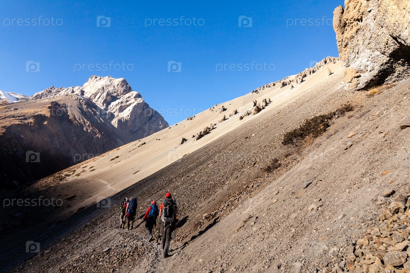 Туристы отправляются в поход к озеру Тиличо (Тиличо Тал 4920 м) в хребте Аннапурна в Гималаях, район Мананг в Непале