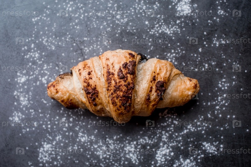 Вкусные свежеиспеченные круассаны с шоколадом на темном фоне. Французский завтрак. Вкусная выпечка крупным планом. Контекст пекарни с вкусным хлебом. Кондитерские изделия