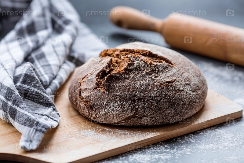 Свежий вкусный хлеб крупным планом. Свежеиспеченный хлеб на закваске с золотой корочкой на деревянной доске. Контекст пекарни с вкусным хлебом. Кондитерские изделия