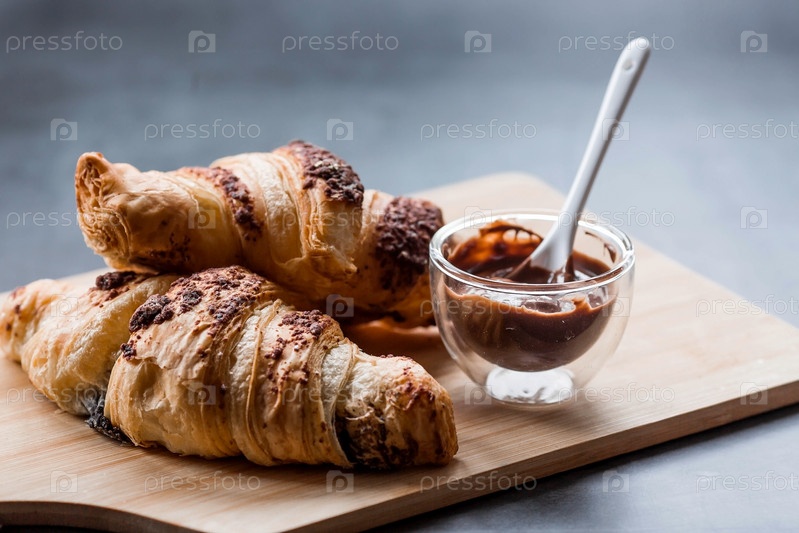 Вкусные свежеиспеченные круассаны с шоколадом на темном фоне. Французский завтрак. Вкусная выпечка крупным планом. Контекст пекарни с вкусным хлебом. Кондитерские изделия