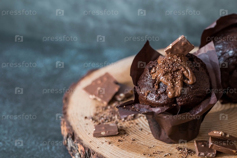 Вкусные свежеиспеченные шоколадные кексы на темном фоне. Вкусный кекс крупным планом. Контекст пекарни с выпечкой. Кондитерские изделия