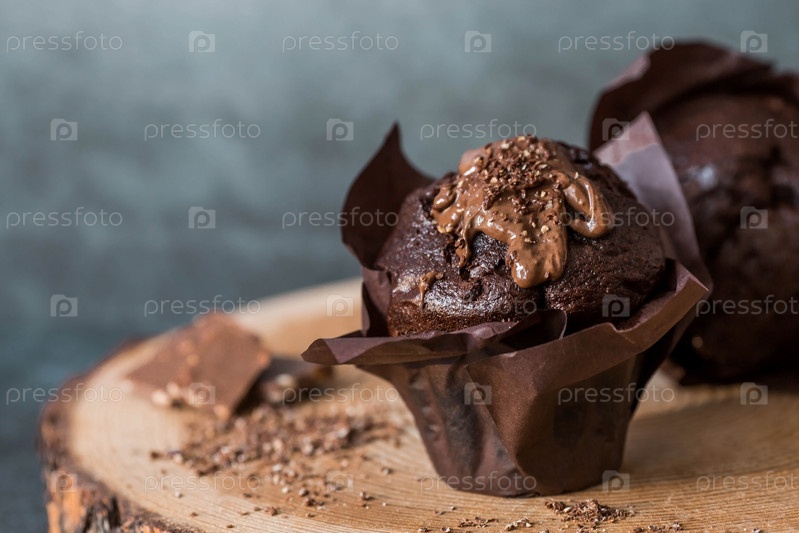 Вкусные свежеиспеченные шоколадные кексы на темном фоне. Вкусный кекс крупным планом. Контекст пекарни с выпечкой. Кондитерские изделия
