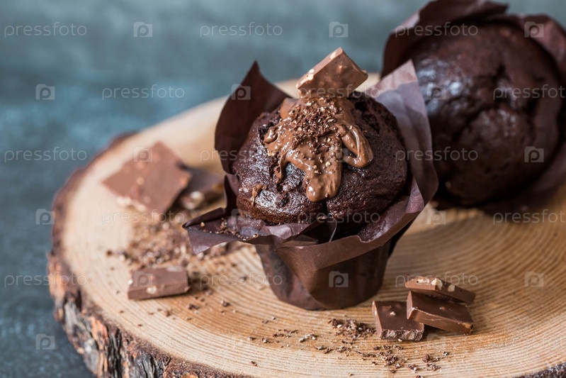 Вкусные свежеиспеченные шоколадные кексы на темном фоне. Вкусный кекс крупным планом. Контекст пекарни с выпечкой. Кондитерские изделия