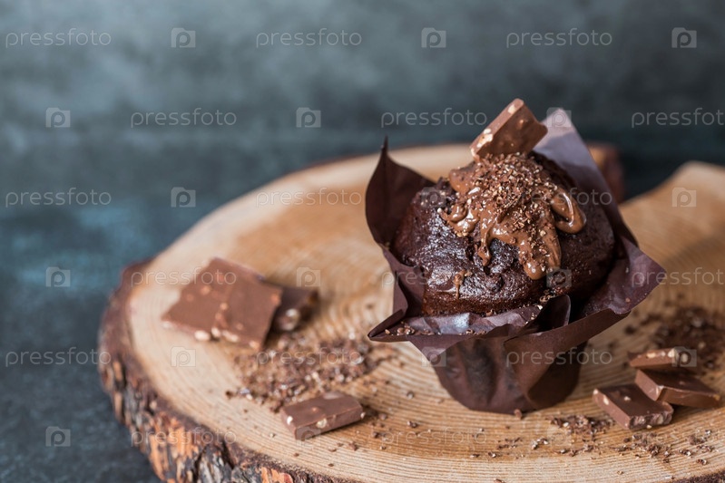 Вкусные свежеиспеченные шоколадные кексы на темном фоне. Вкусный кекс крупным планом. Контекст пекарни с выпечкой. Кондитерские изделия