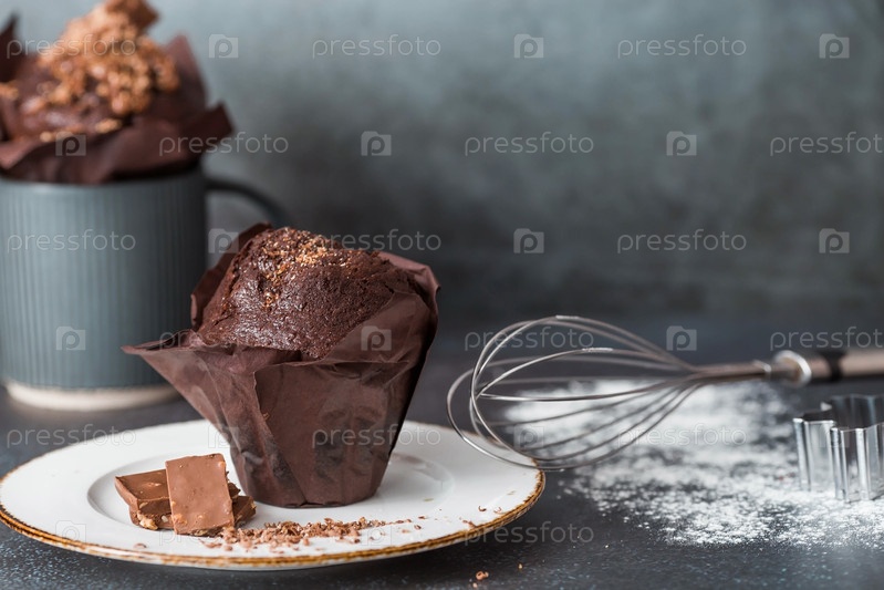 Вкусные свежеиспеченные шоколадные кексы на темном фоне. Вкусный кекс крупным планом. Контекст пекарни с выпечкой. Кондитерские изделия