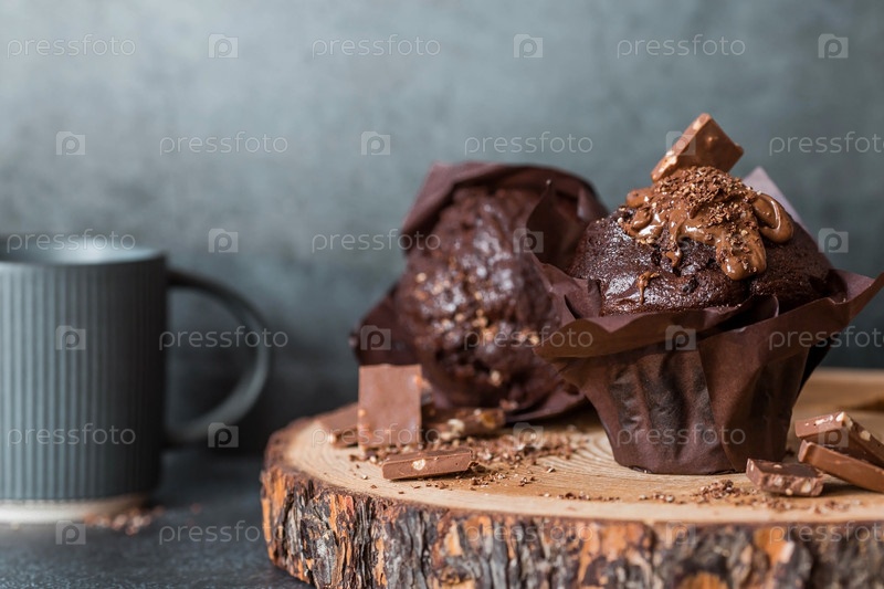 Вкусные свежеиспеченные шоколадные кексы на темном фоне. Вкусный кекс крупным планом. Контекст пекарни с выпечкой. Кондитерские изделия
