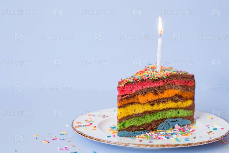 Радужный праздничный торт, украшенный праздничной свечой и конфетти. Кондитерские изделия. Разноцветный десерт цвета радуги на голубом фоне