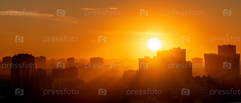 Рассветное солнце над мегаполисом раннего заката