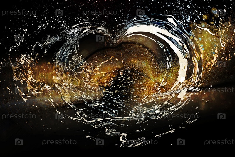 Брызги воды в форме сердца на черном фоне с золотыми блестками