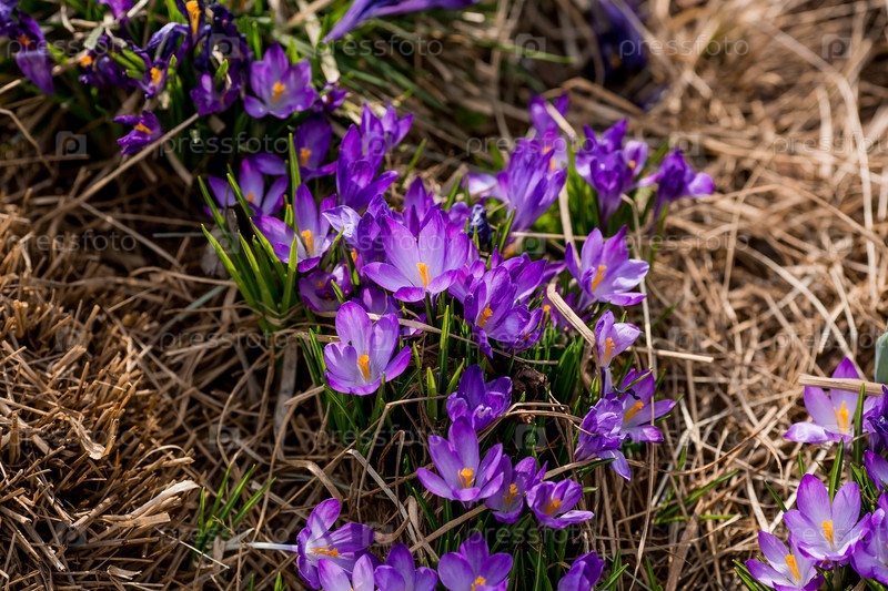 Первые цветки весны - фиолетовые крокусы (лат. crocus) в крупном плане утром под солнечным светом