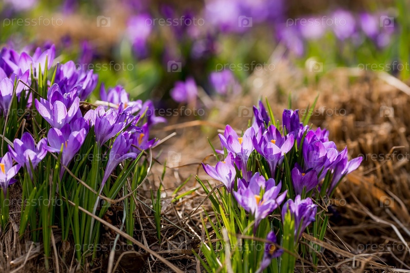 Первые цветки весны - фиолетовые крокусы (лат. crocus) в крупном плане утром под солнечным светом