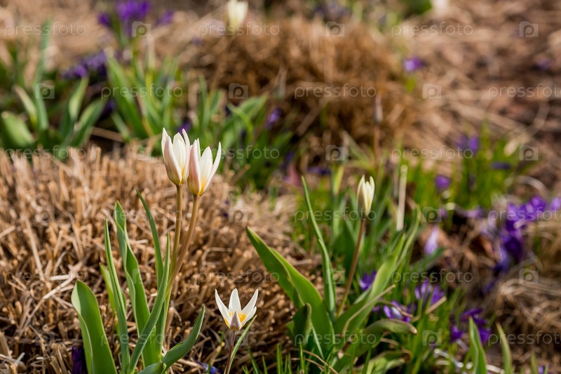 Первые цветки весны - фиолетовые крокусы (лат. crocus) в крупном плане утром под солнечным светом