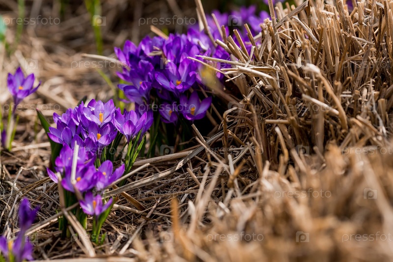Первые цветки весны - фиолетовые крокусы (лат. crocus) в крупном плане утром под солнечным светом