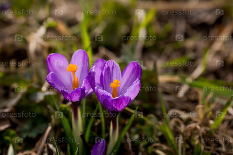 Первые цветки весны - фиолетовые крокусы (лат. crocus) в крупном плане утром под солнечным светом