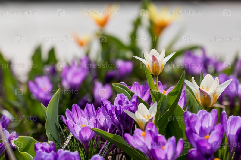 Первые цветки весны - фиолетовые крокусы (лат. crocus) в крупном плане утром под солнечным светом