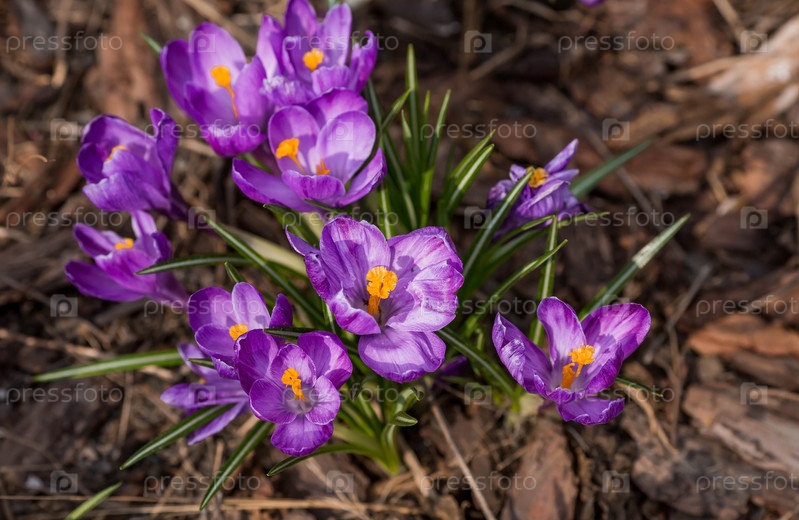 Первые цветки весны - фиолетовые крокусы (лат. crocus) в крупном плане утром под солнечным светом