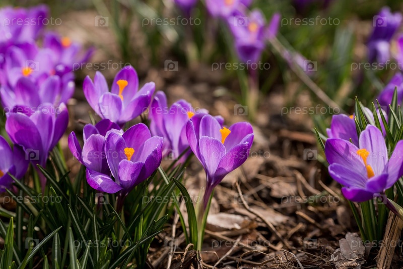 Первые цветки весны - фиолетовые крокусы (лат. crocus) в крупном плане утром под солнечным светом