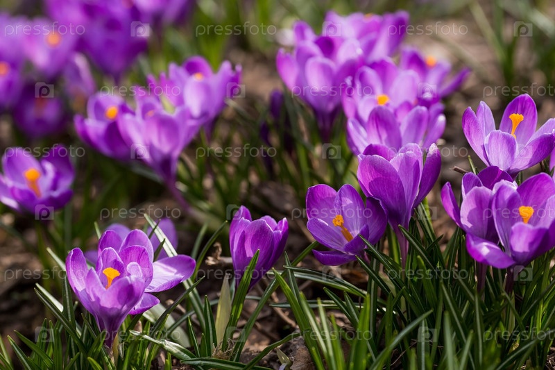 Первые цветки весны - фиолетовые крокусы (лат. crocus) в крупном плане утром под солнечным светом