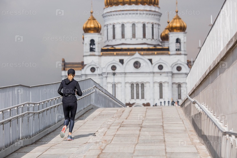 Спортивные занятия. Весенним днем на фоне храма Христа Спасителя в Москве бежит девушка в спортивной форме. Российская Федерация, Москва