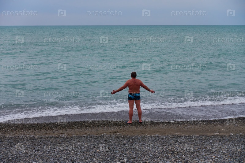 Лазурное зимнее море и галечный пустынный пляж. Взрослый опытный мужчина загорает, раскинув руки, на холодном берегу моря